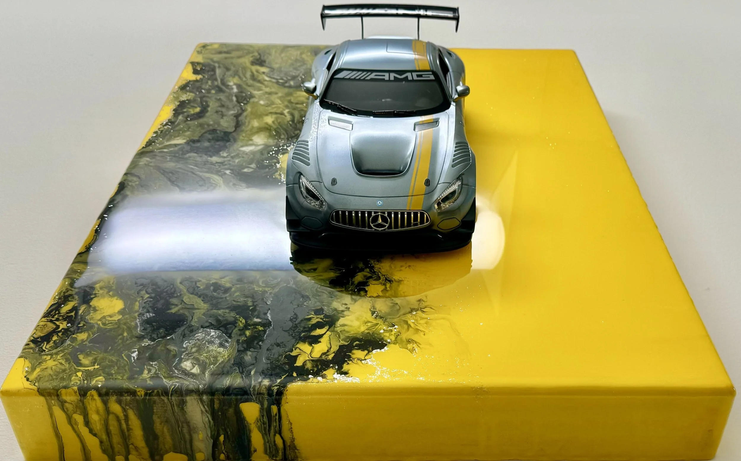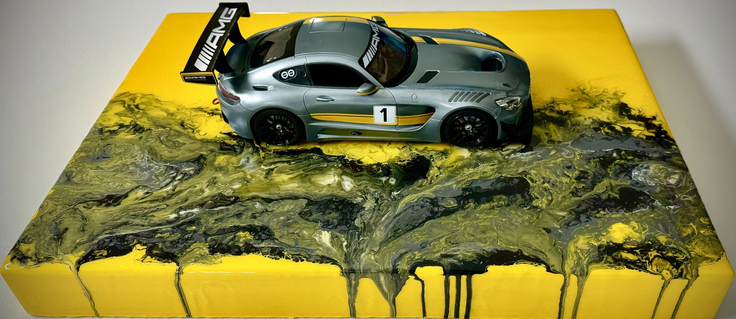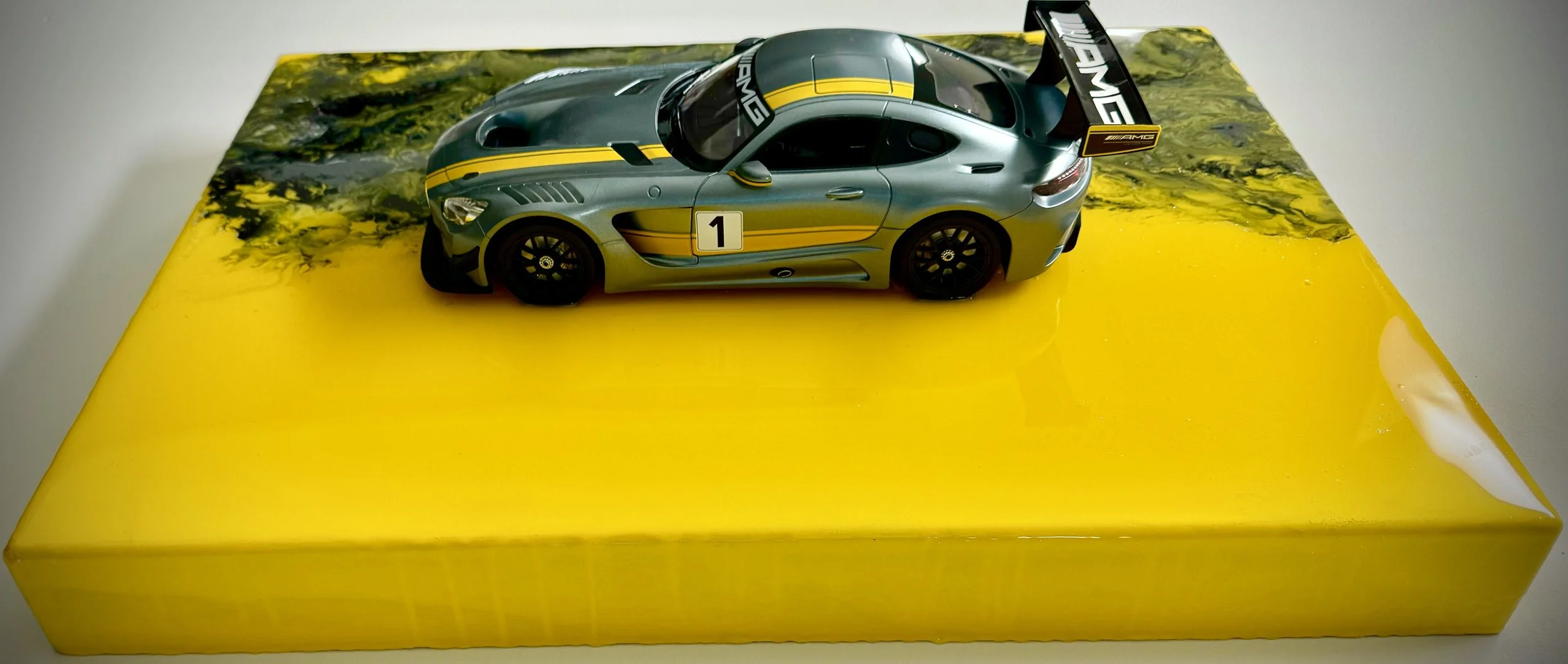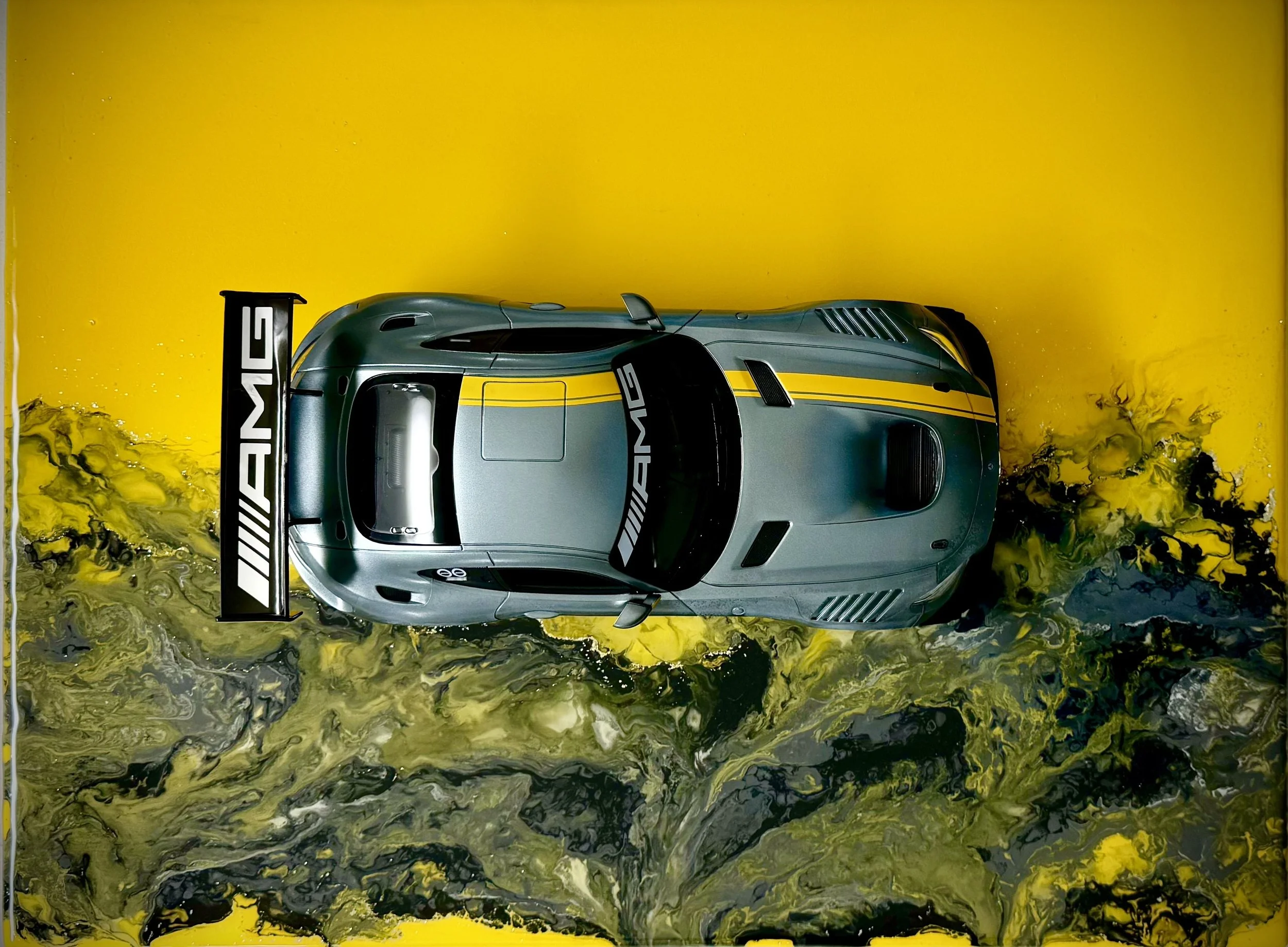 At the center of the artwork is a detailed scale model of the AMG GT3, finished in metallic grey with racing stripes and bold AMG branding. The car is mounted on a high-gloss epoxy resin panel featuring a striking yellow background with flowing black, grey, and metallic resin patterns that create a powerful sense of movement.