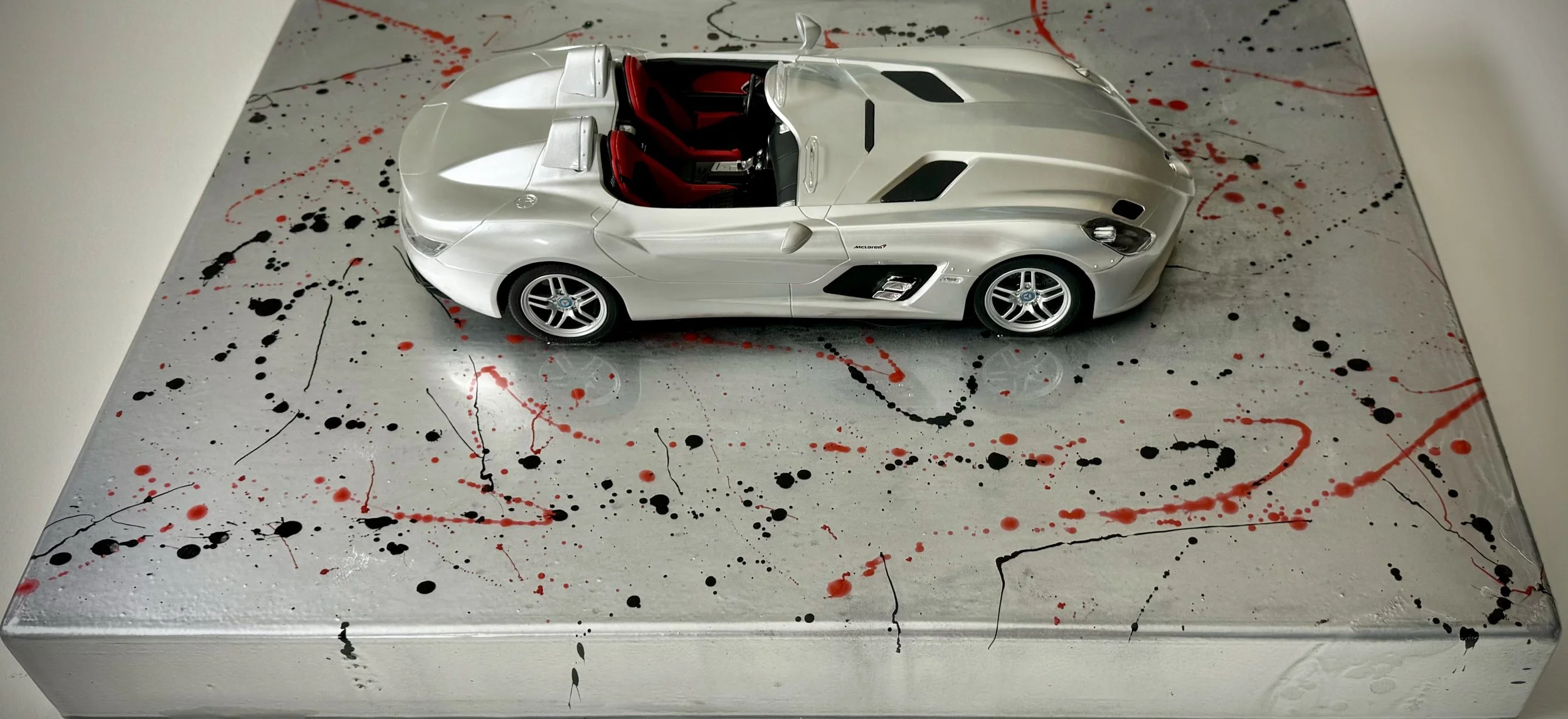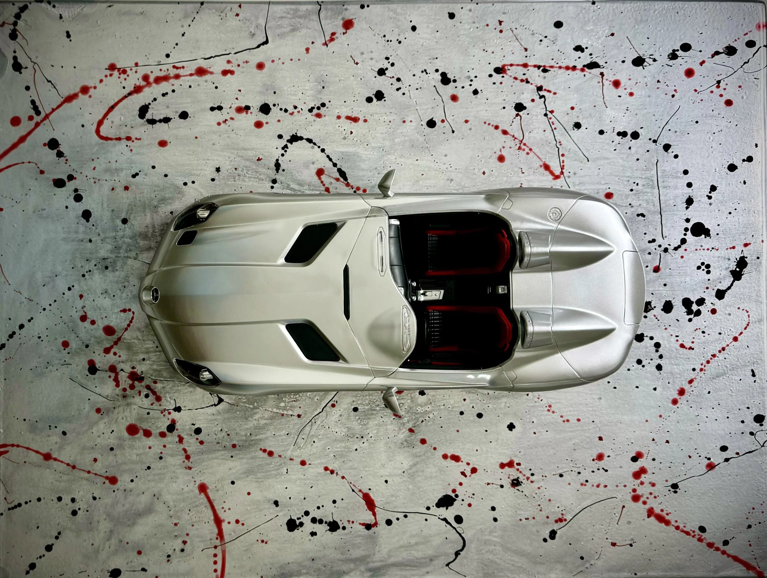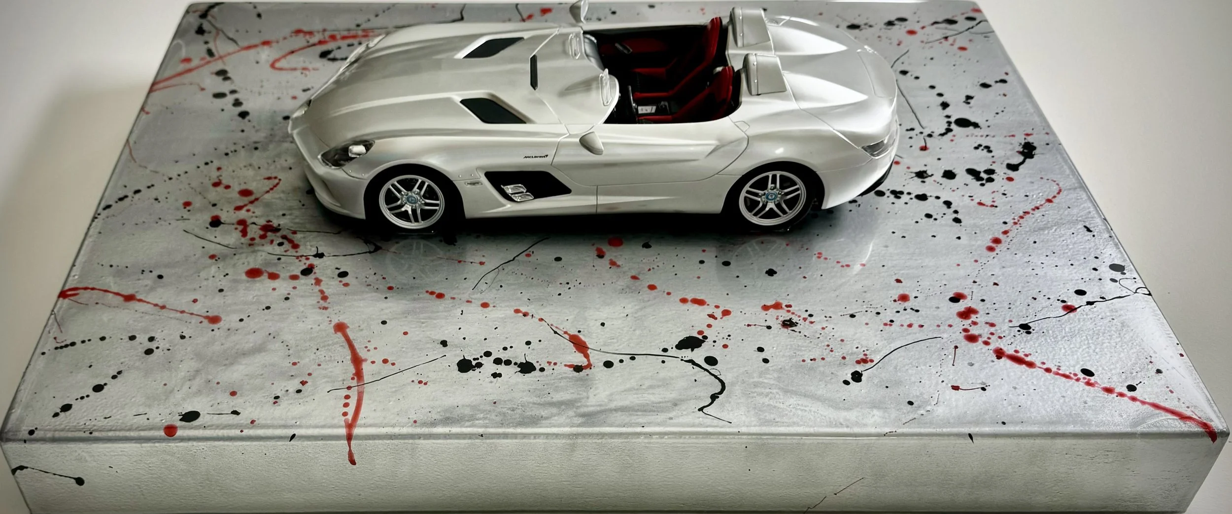 The detailed silver speedster model is mounted on a sleek metallic resin panel featuring expressive black and red paint splatter accents. The layered epoxy resin creates a smooth, high-gloss finish that reflects light and enhances the sculpted lines of the SLR.