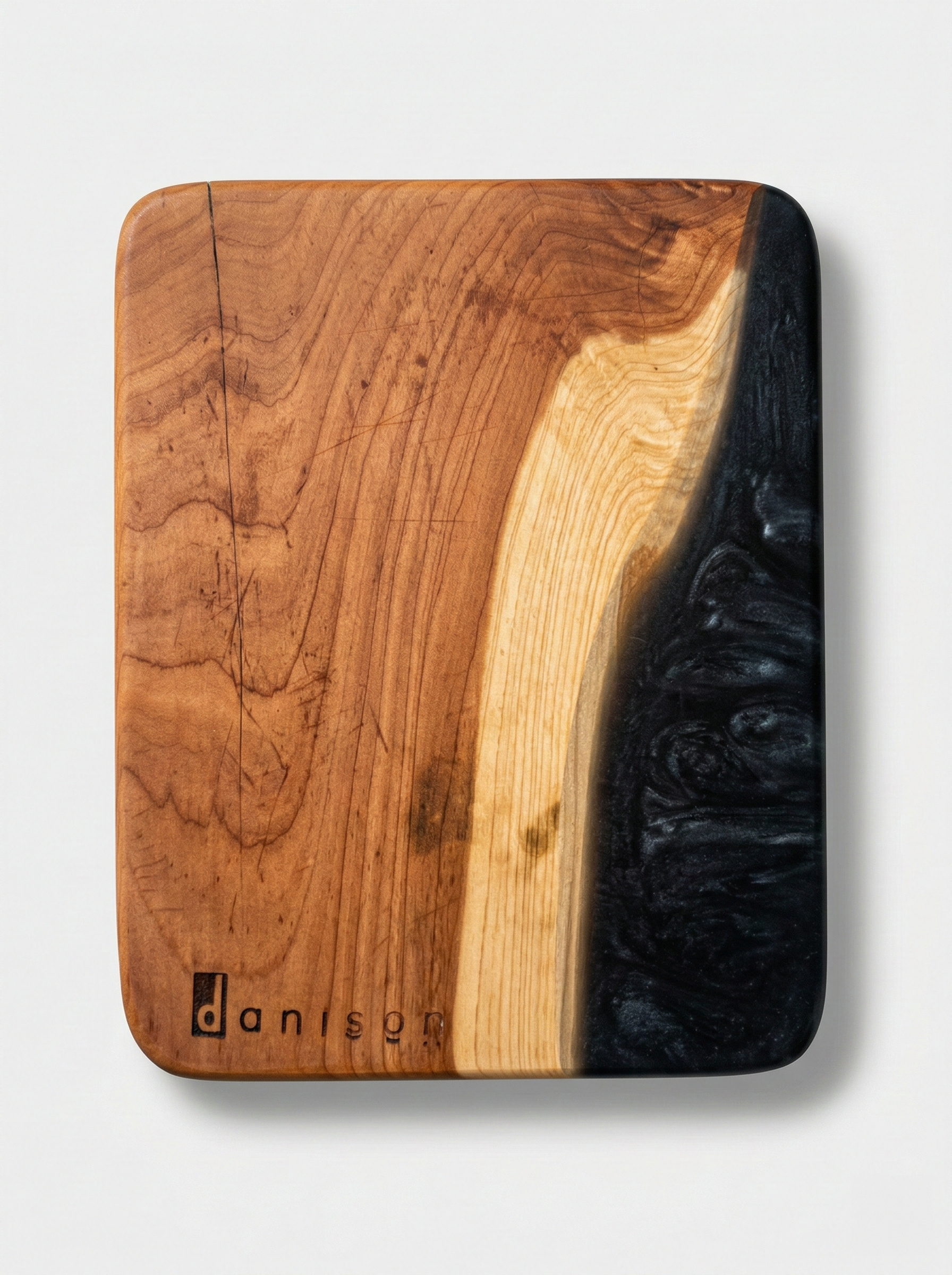 This handcrafted mini bar board features a striking blend of natural hardwood and deep black resin. The warm wood grain showcases beautiful organic lines and tonal variation, highlighted by a lighter live-edge detail that flows seamlessly into the rich, swirling resin accent. The contrast between the earthy wood and bold resin creates a modern yet timeless look.
