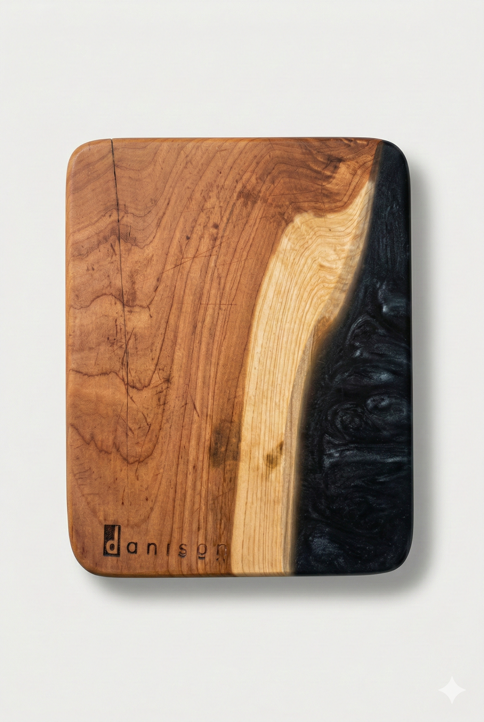 This handcrafted mini bar board features a striking blend of natural hardwood and deep black resin. The warm wood grain showcases beautiful organic lines and tonal variation, highlighted by a lighter live-edge detail that flows seamlessly into the rich, swirling resin accent. The contrast between the earthy wood and bold resin creates a modern yet timeless look.