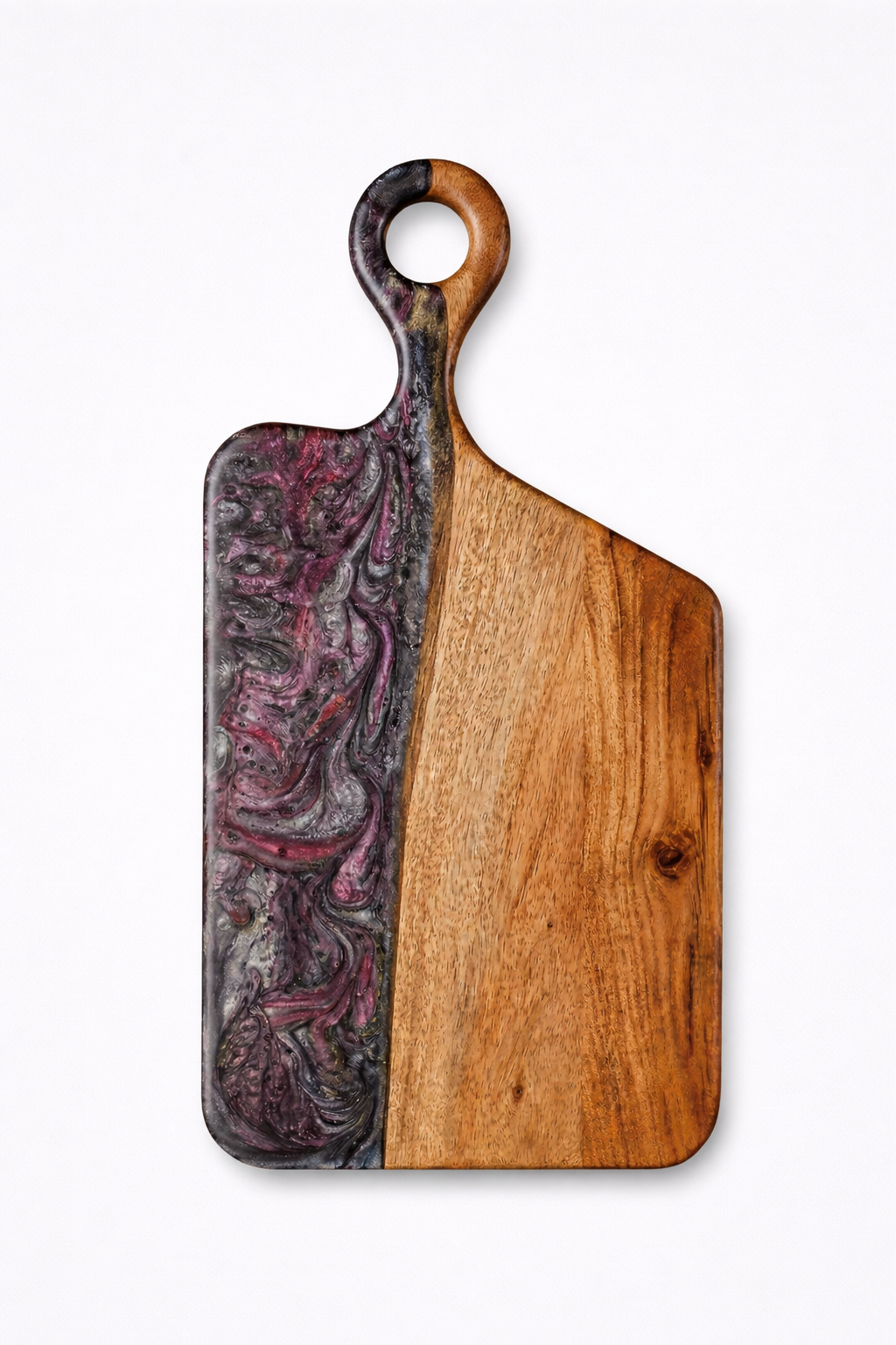 Expertly shaped and hand-finished to a smooth, satin feel, the board highlights the organic character of the wood — from subtle knots to distinctive grain lines — while the resin adds depth, movement, and a contemporary edge. The seamless transition between materials reflects careful craftsmanship and attention to detail.