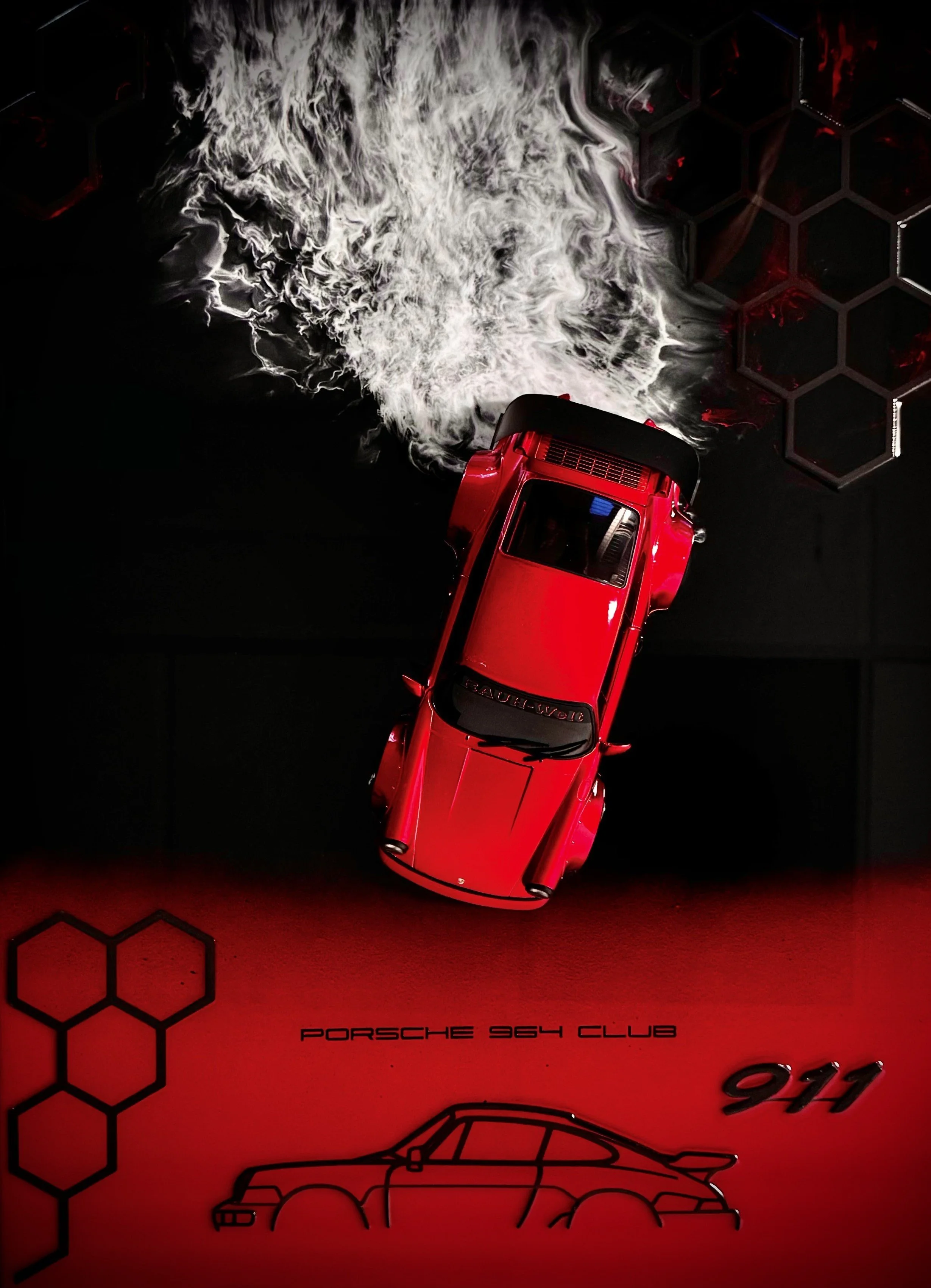 Geometric honeycomb accents and Porsche-inspired design elements add a modern motorsport aesthetic, while the deep glossy resin finish creates a glass-like surface that enhances reflections and depth.