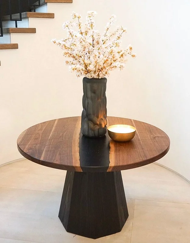The table is supported by a custom sculptural wooden base, designed with clean geometric lines that taper elegantly toward the floor. Its faceted form adds visual depth and modern character while providing excellent strength and stability. The dark finish of the base beautifully contrasts the warmth of the wood top, creating a balanced and sophisticated look.